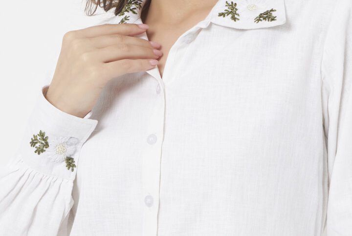Delicate embroidery flows gently across the fabric, adding a touch of artistry while preserving its effortless simplicity. The silhouette is fluid yet structured, allowing you to move freely while holding a refined presence.